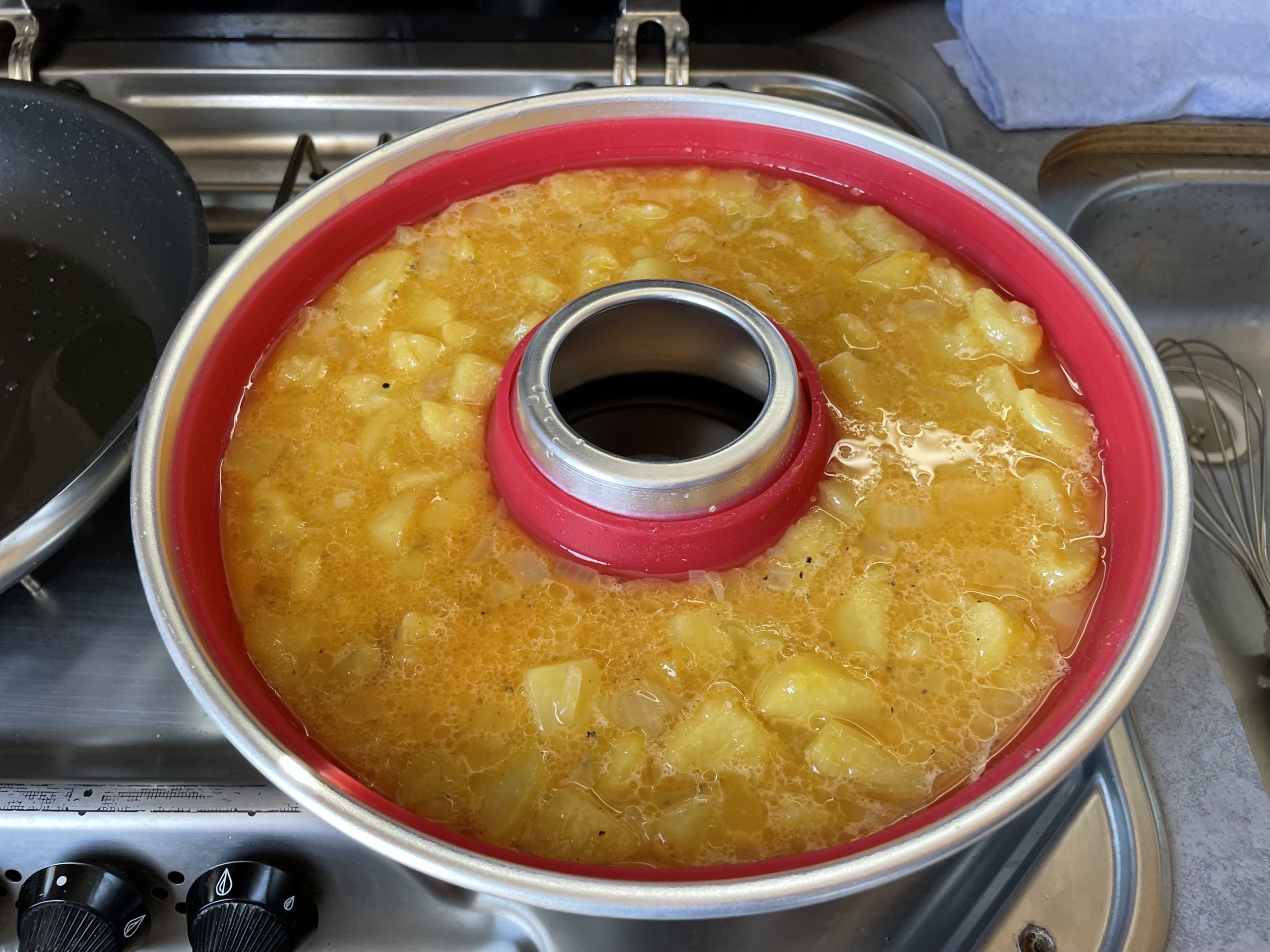 • Anschließend mit der Eiermasse vermischen & alles in den Omnia Camping Backofen mit Silikoneinlage füllen.