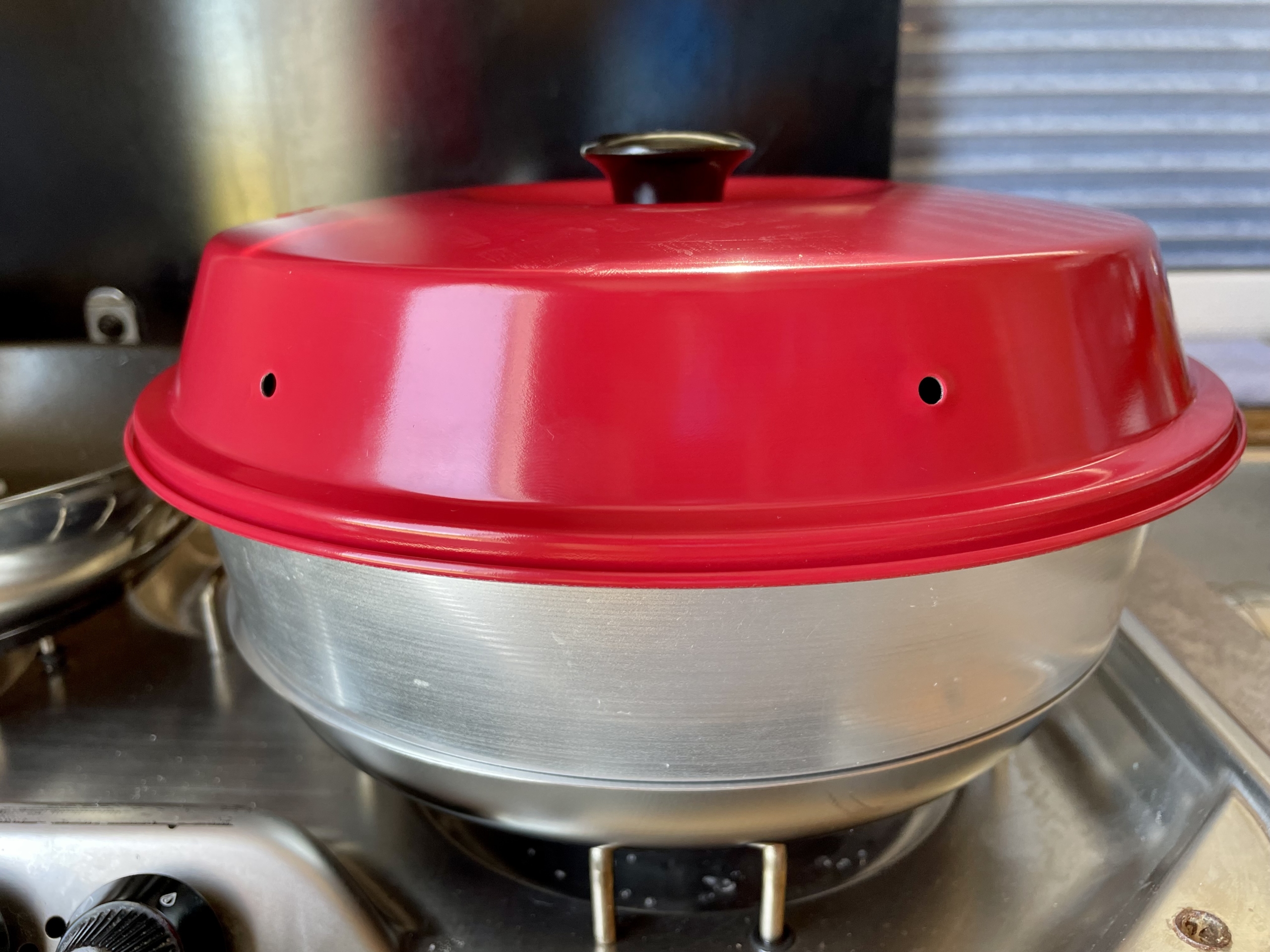 • Jetzt nur noch den Wärmeverteiler auf den Herd stellen, Omnia Camping Backofen daraufstellen und mit dem Deckel verschließen.