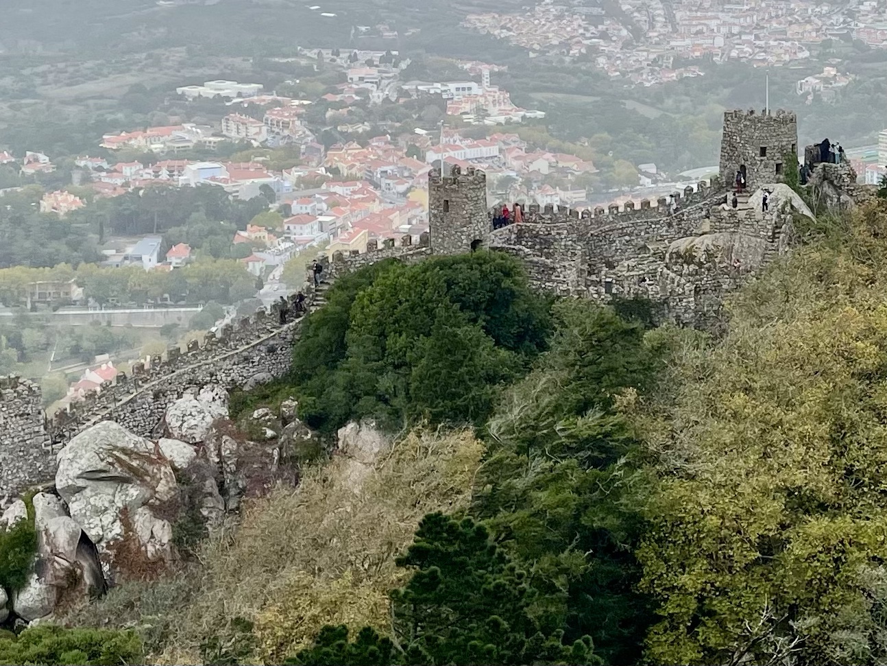 Die Maurische Burg, auch bekannt als »Castelo dos Mouros,« befindet sich ebenfalls in Sintra und thront hoch über der Stadt auf einem Hügel. Sie wurde im 8. und 9. Jahrhundert von den Mauren errichtet, um die Region zu verteidigen. Vom historischen Zentrum kann man entweder zu Fuß gehen oder touristische Verkehrsmittel nutzen, um etwas näher an die Burg heranzukommen. Wir lehnen die überteuerte One Way Fahrt mit dem Tuk Tuk dankend ab und gehen zu Fuß. Es gibt verschiedene Wege, die zur Burg führen, einige sind kürzer, dafür aber etwas steiler. Der Aufstieg kann je nach Tempo und Pausen zwischen 20 Minuten und einer Stunde dauern. Unser Weg ist gut markiert. Es gibt viele Sitzgelegenheiten, um auszuruhen oder um die Aussicht zu genießen. Wir sind froh, dass wir uns für den lohnenswerten Fußweg entschieden haben. Die Burgmauern schlängeln sich über den Hügel, und es ist ein Erlebnis, auf den schmalen Wegen an dieser Mauer zu spazieren. Von hier aus haben wir einen fantastischen Blick auf Sintra und die umliegende Landschaft. An klaren Tagen soll man sogar bis zum Atlantik blicken können.