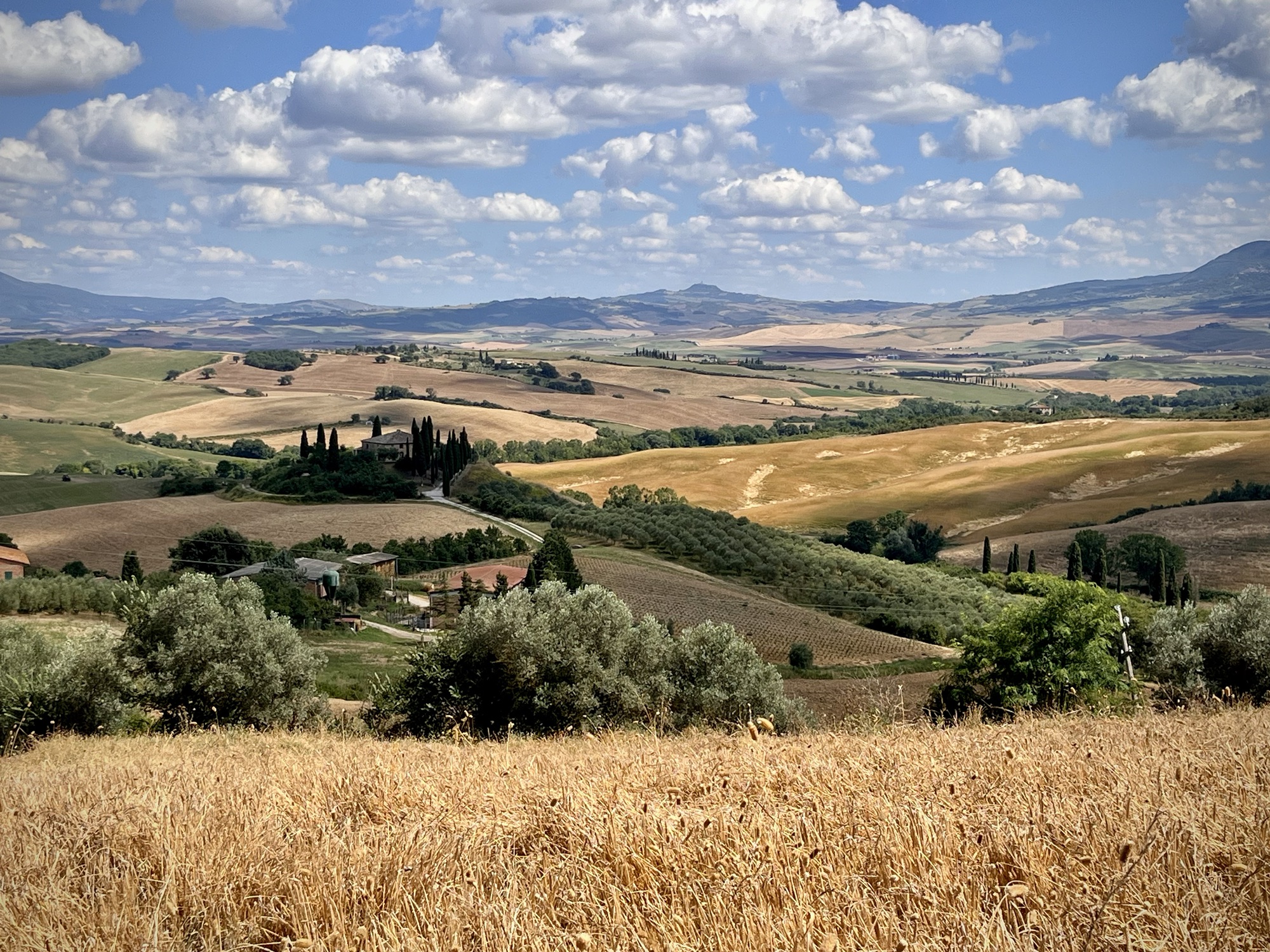 Wir erreichen Val d’Orcia eine wirklich schöne Region in der Toskana. Sie ist bekannt für den Brunello di Montalcino und den Vino Nobile di Montepulciano. Diese Weine passen nicht nur hervorragend zur lokalen Küche, sondern werden auch weltweit geschätzt. Die sanften Hügel mit den Olivenhainen, den idyllischen Weinbergen, den Zypressenalleen und den goldenen Weizenfeldern sind echte Postkartenmotive. Sie haben schon viele Künstler und Fotografen inspiriert. Die historischen Städte und Dörfer liegen märchenhaft in den Hügeln. Aufgrund ihrer außergewöhnlichen Schönheit wurde die Val d’Orcia Region 2004 zum UNESCO-Weltkulturerbe erklärt. Wir können das nachvollziehen und hoffen, dass dieses schöne Fleckchen Erde noch lange erhalten bleibt. 🫶