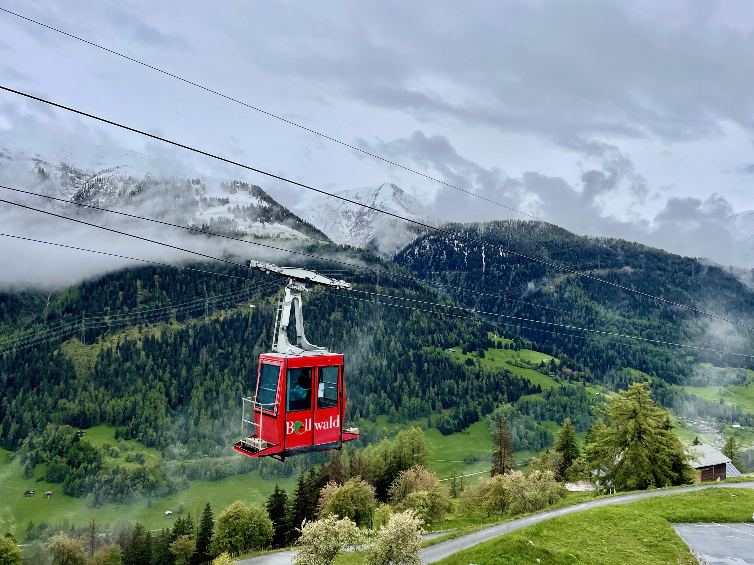 Unsere Reise führt uns weiter in die 1.600 Meter hoch gelegene Gemeinde Bellwald, die inmitten der Walliser Alpen liegt. Wir folgen der kurvenreichen Straße hinauf und benötigen deutlich mehr Zeit als die kleine rote Gondel. Die Kabinen der Luftseilbahn starten an der Talstation Fürgangen und an der Bergstation Bellwald zur gleichen Zeit.